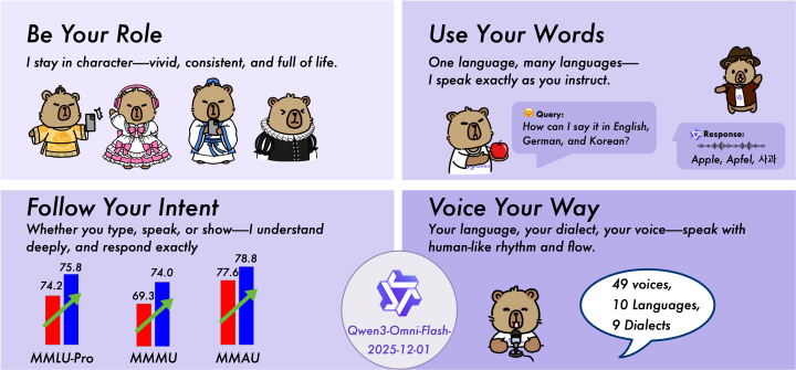 IT之家12月11日消息,阿里Qwen团队于2025年12月9日发布博文,宣布推出新一代原生全模态大模型Qwen3-Omni-Flash-2025-12-01,该模型在Qwen3-Omni基础上进行了全面升级,支持文本、图像、音视频的无缝输入与实时流式输出。